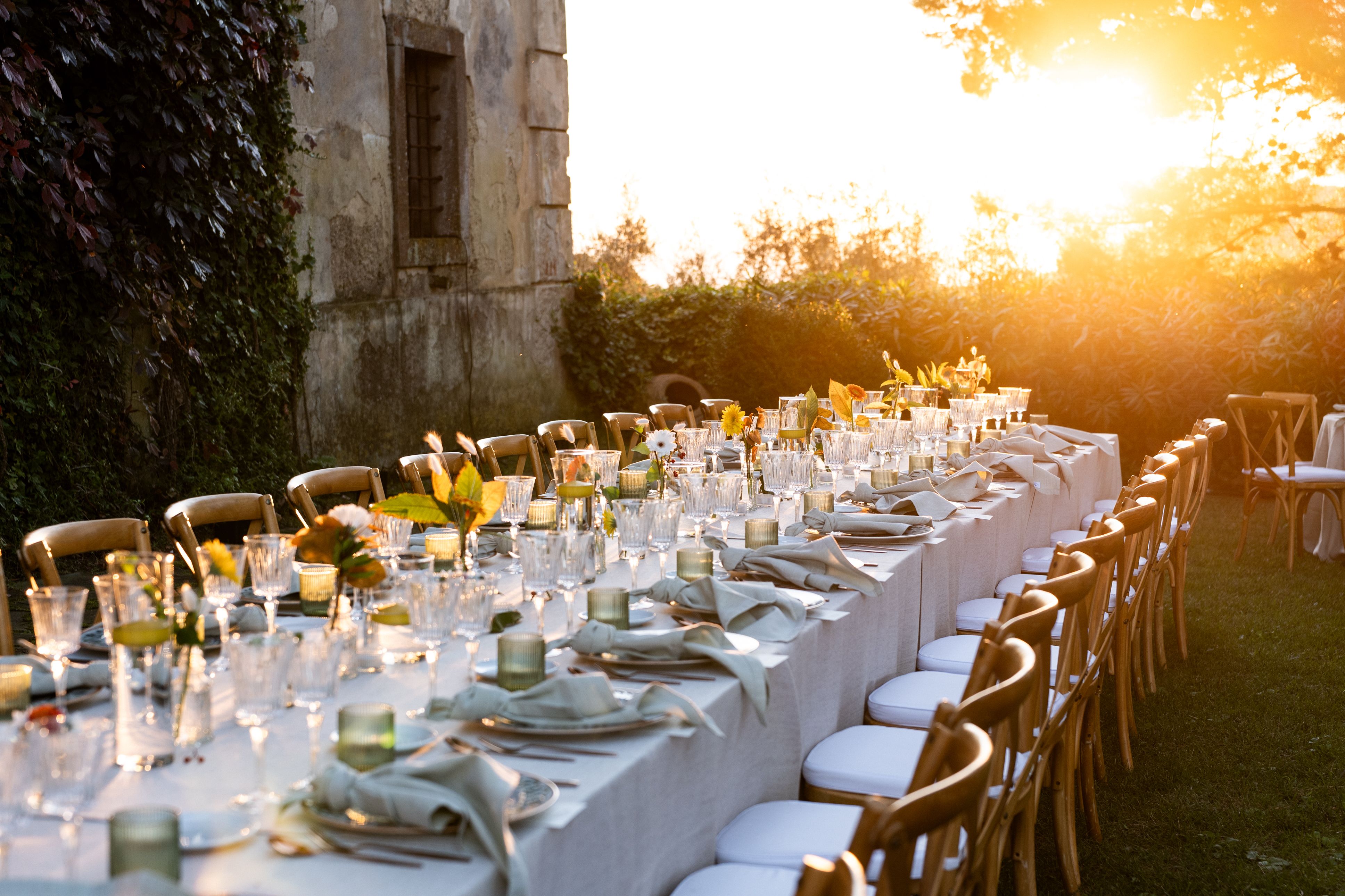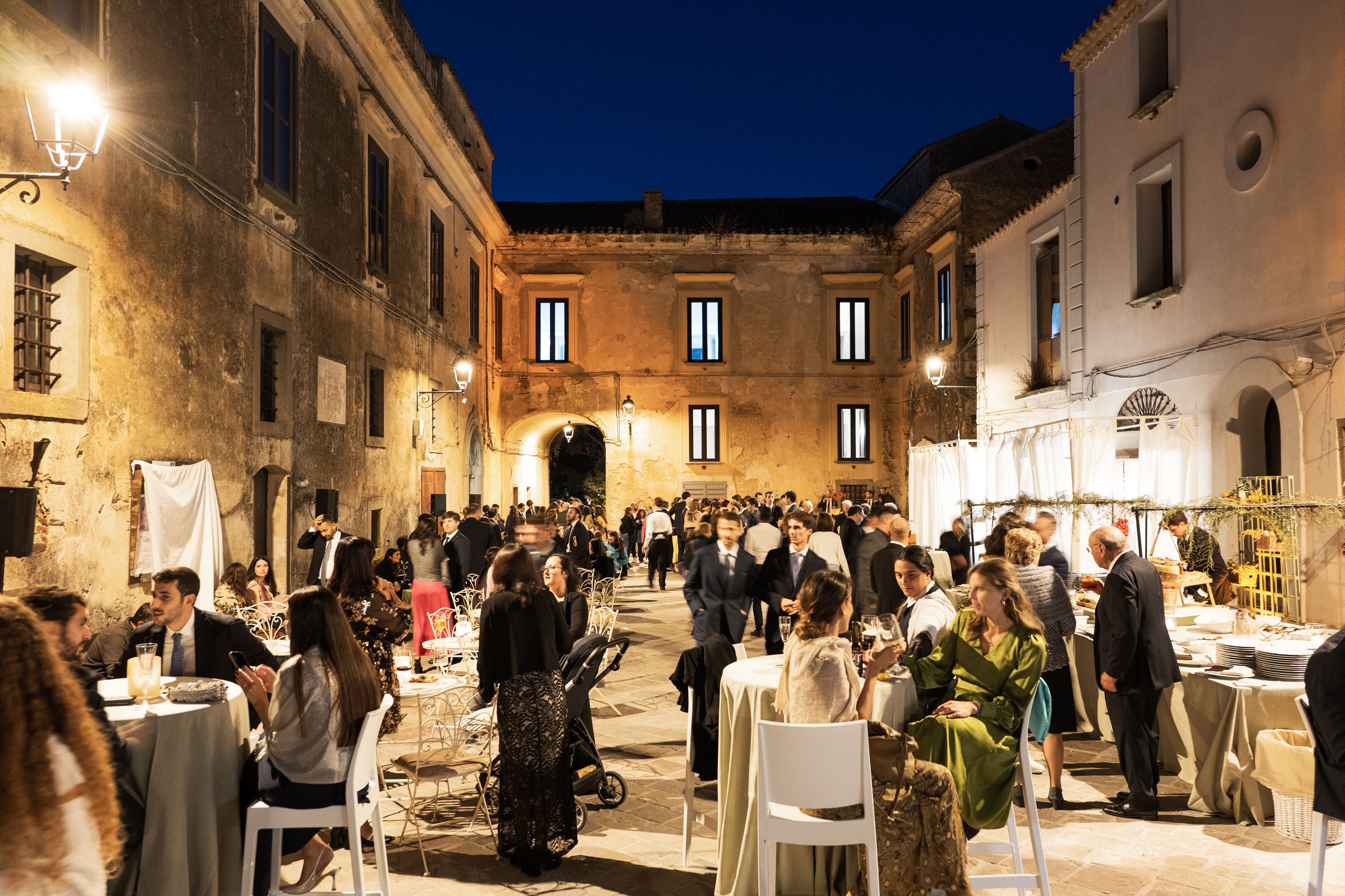 Dopo la cerimonia, gli ospiti sono stati accolti nella piazzetta antistante Palazzo Mazziotti, per poi spostarsi nel giardino della villa dove si è svolta la cena. Il tutto curato nei minimi dettagli dal catering E Maiuscola Eventi: allestimenti raffinati, luci soft, natura tutt’intorno.